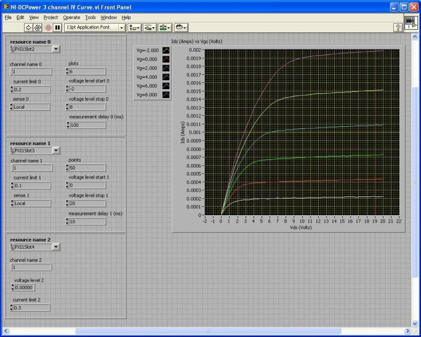 2. Put the wafer on the probe station chuck and vacuum it down. (More info on steps 2-5 is available on the probe station's page) 3. Turn on the Sony TV and Panasonic Desktop Editor. (To see through the microscope) 4. Move the station's probes into their appropriate positions on the wafer. 5. Connect the appropriate wires from the analyzer to the probe station, and make sure the probes are connected to the correct color-coded jack. 6. Open the LabVIEW program on the computer next to the probe station by clicking on the desktop folder called "NI PXI-4130..." and then "NI-DCPower